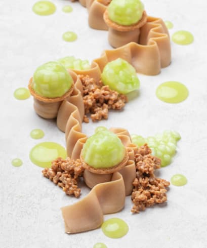 Set aside a portion of the Almond Streusel and roll it out between parchment paper to a thickness of 2.5mm.Let chill in the refrigerator and cut 3cm discs (3 per plate). Bake at 302˚F (150°C).When the Compote is ready, spoon into 2.5cm half sphere silicon molds and freeze. Reserve a portion for plating.On a long plate, pipe the Crémeux (using a special petal piping tip) in a wavy line (see picture), and with a large round tip, also pipe 3 drops of Crémeux.With a spoon, add the Coated Streusel and the reserved Apple Celery Ginger Compote.On top of the Crémeux drops, place a disc of Streusel.Unmold the half spheres of Compote, and let defrost several minutes before plating.Place the half spheres of Compote on the Streusel discs and finish decorating with Apple Celery Ginger Sauce.