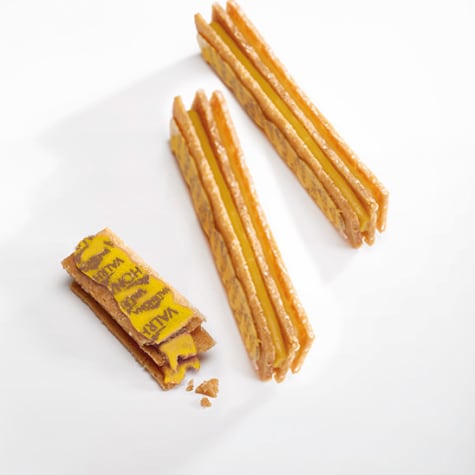 Make the crunch and spread it between two large sheets of confectionery dipping paper to a thickness of about 2mm.Freeze.Prepare the ganache and put it in the refrigerator.Once it has completely cooled, cut out 12 x 2cm rectangles of cookie crunch.Put these on a micro-perforated silicone baking mat.Bake at 150°C (300°F) for approx. 15 minutes.Leave to cool, then use a piping bag with a 6mm-diameter nozzle to make a strip of approx. 8g of ganache on two out of three rectangles.Place the rectangles one on top of the other so that you obtain three layers of crunch and two layers of ganache. Make a thin layer of pre-set fruit ouverture to go on top, then turn it out onto a printed sheet.